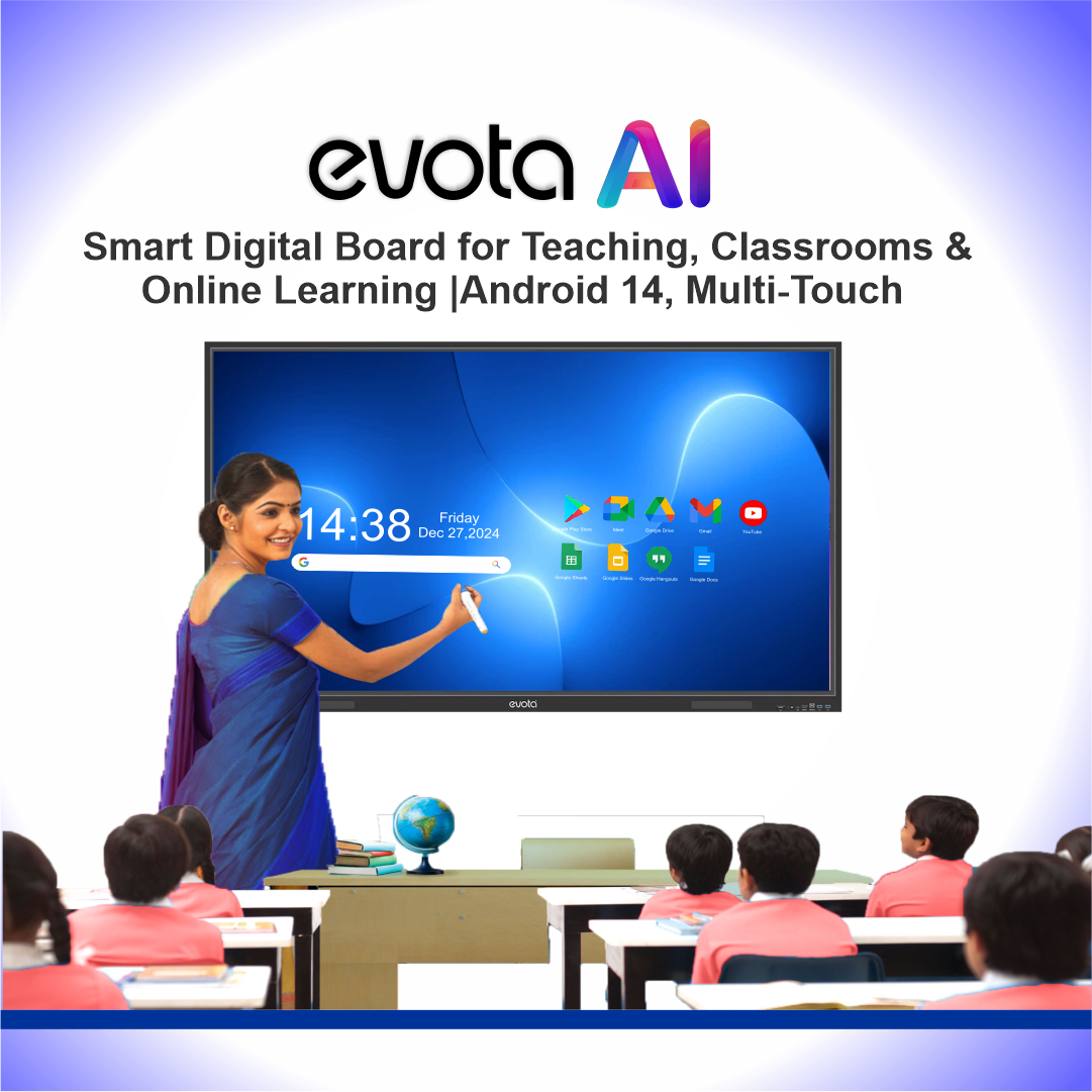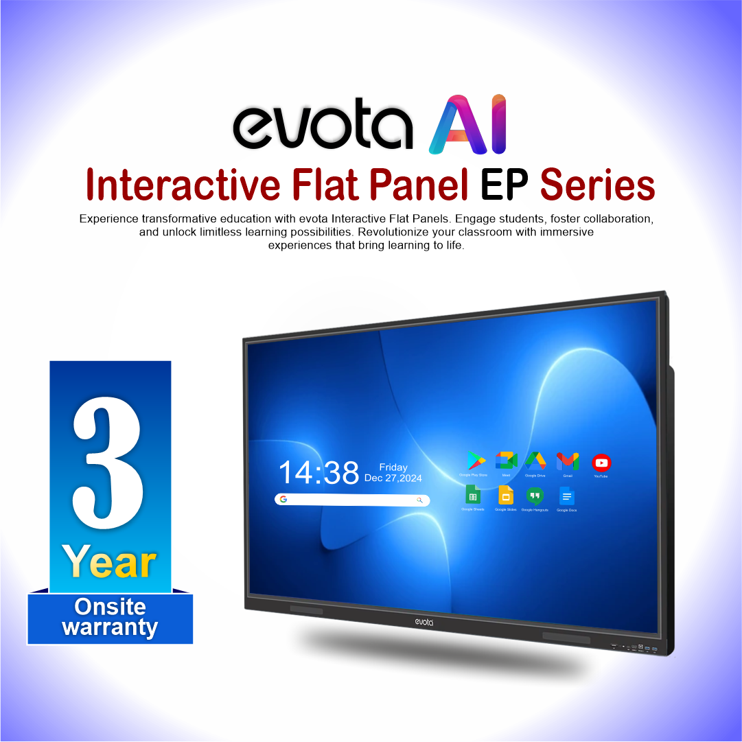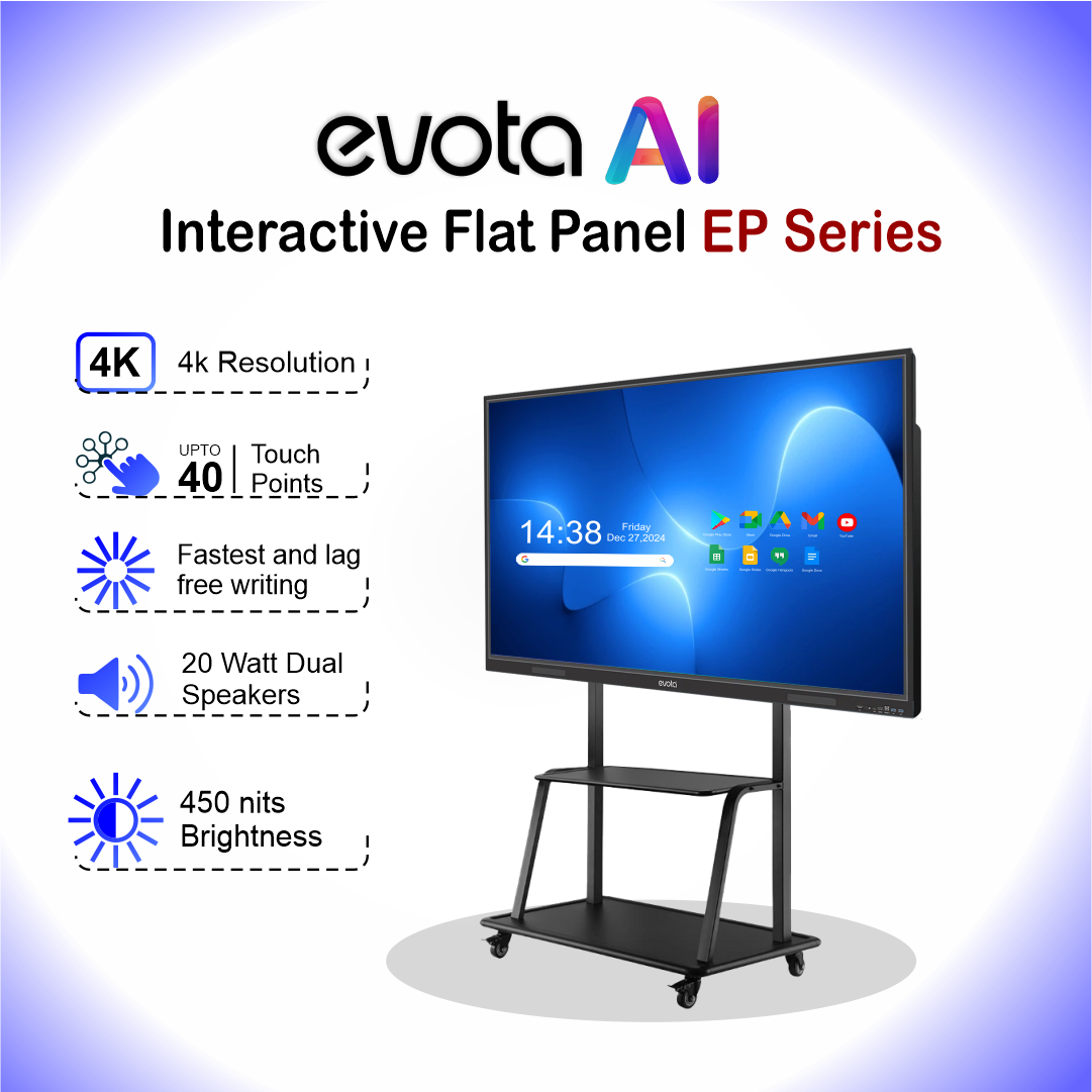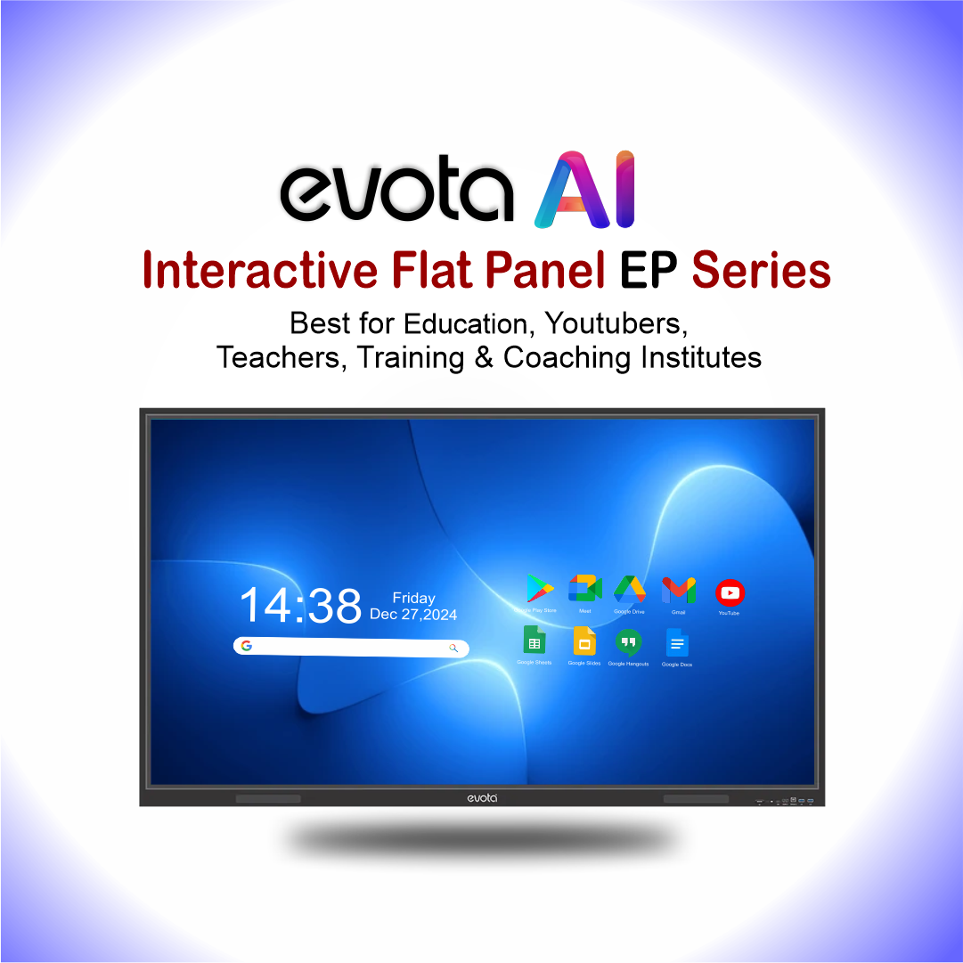The Evota EP65 65-inch AI-Powered Interactive Display is built for the future of smart collaboration in classrooms, training halls, and business boardrooms. Equipped with a stunning 4K Ultra HD display, Android 14 OS, and AI-enhanced features like handwriting recognition, smart annotation, content sharing via QR code, and auto-classroom recording, it redefines digital engagement.