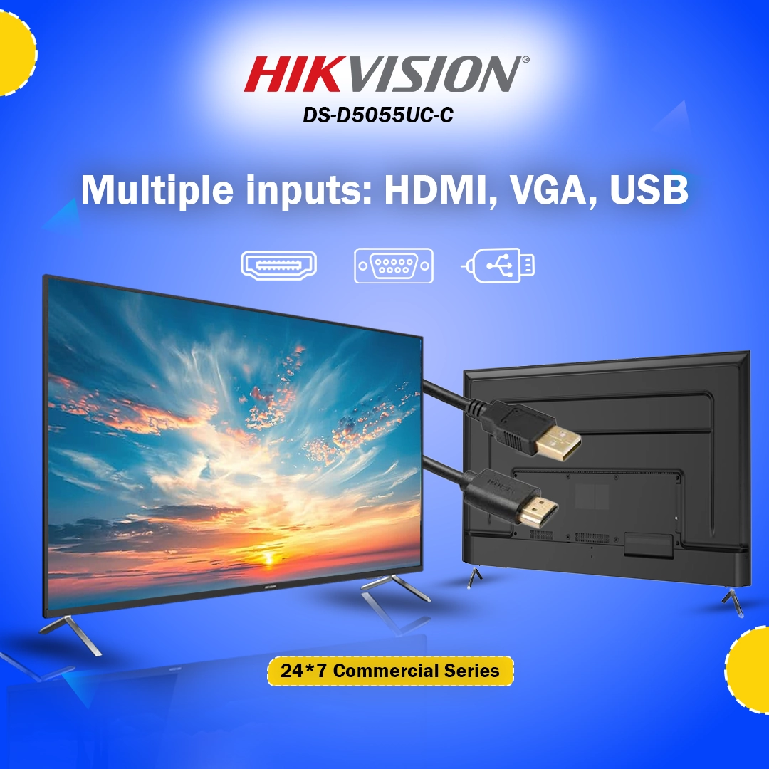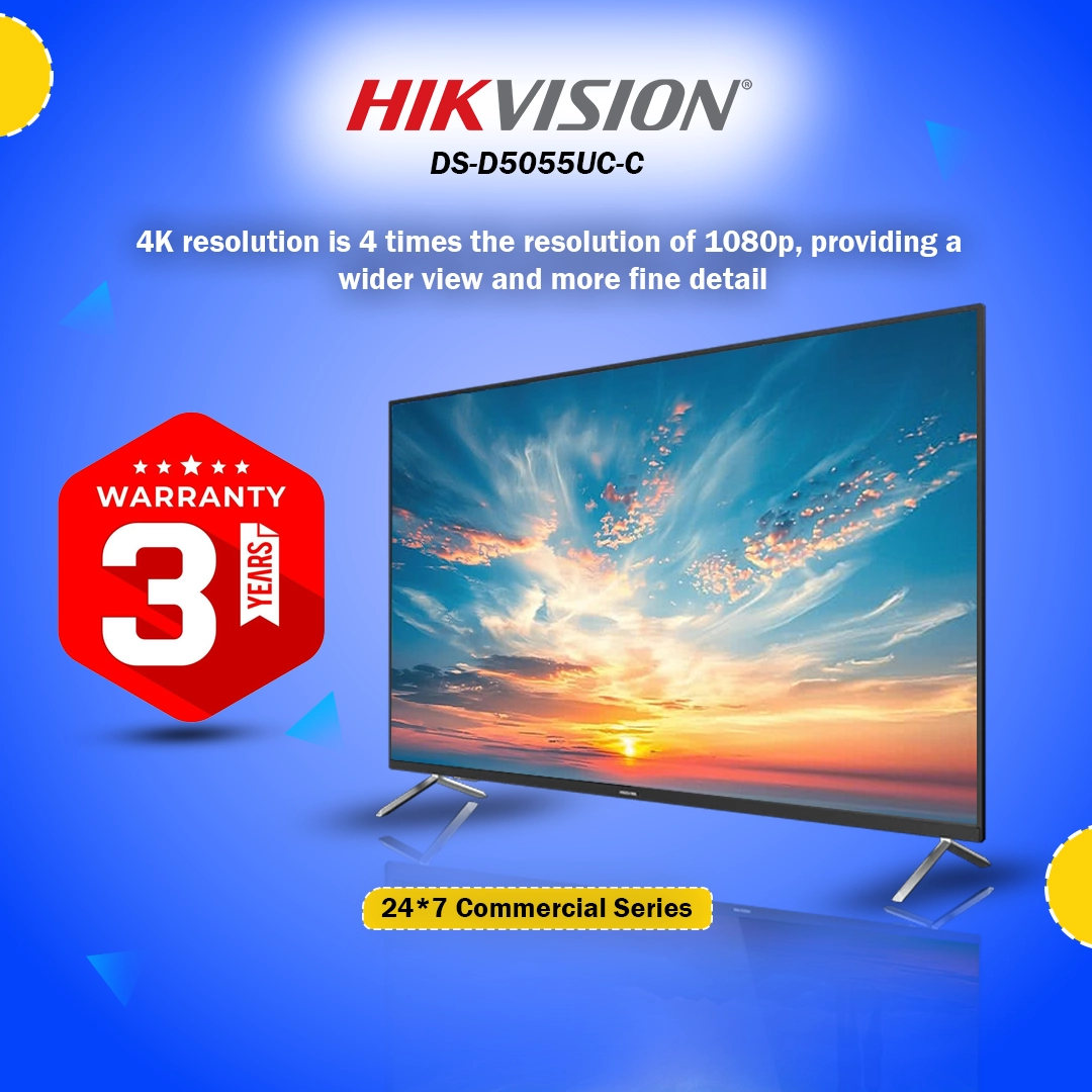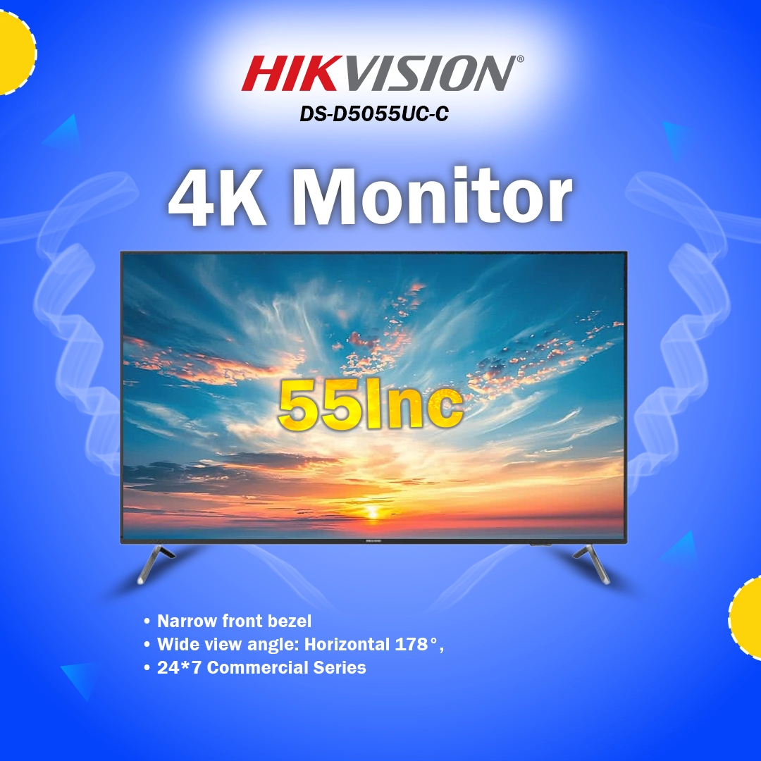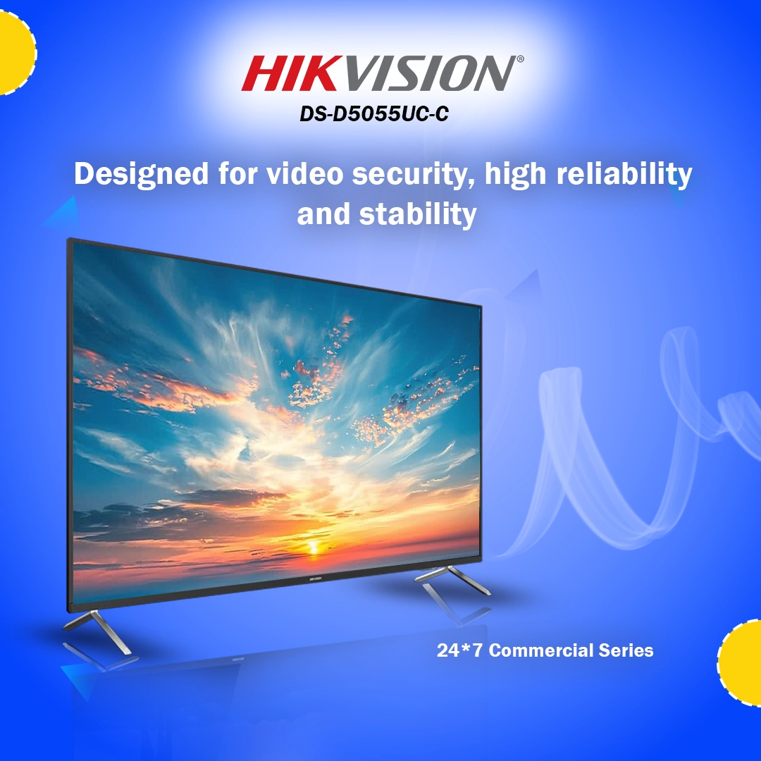Hikvision DS-D5055UC-C is a 55-inch 4K UHD LED monitor built for 24/7 video surveillance, command centers, and signage applications. Featuring HDMI 2.0, VGA, USB inputs, wide 178° viewing angle, and a durable 350 nits panel.