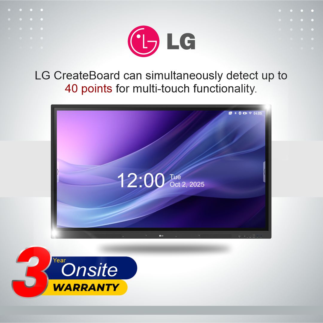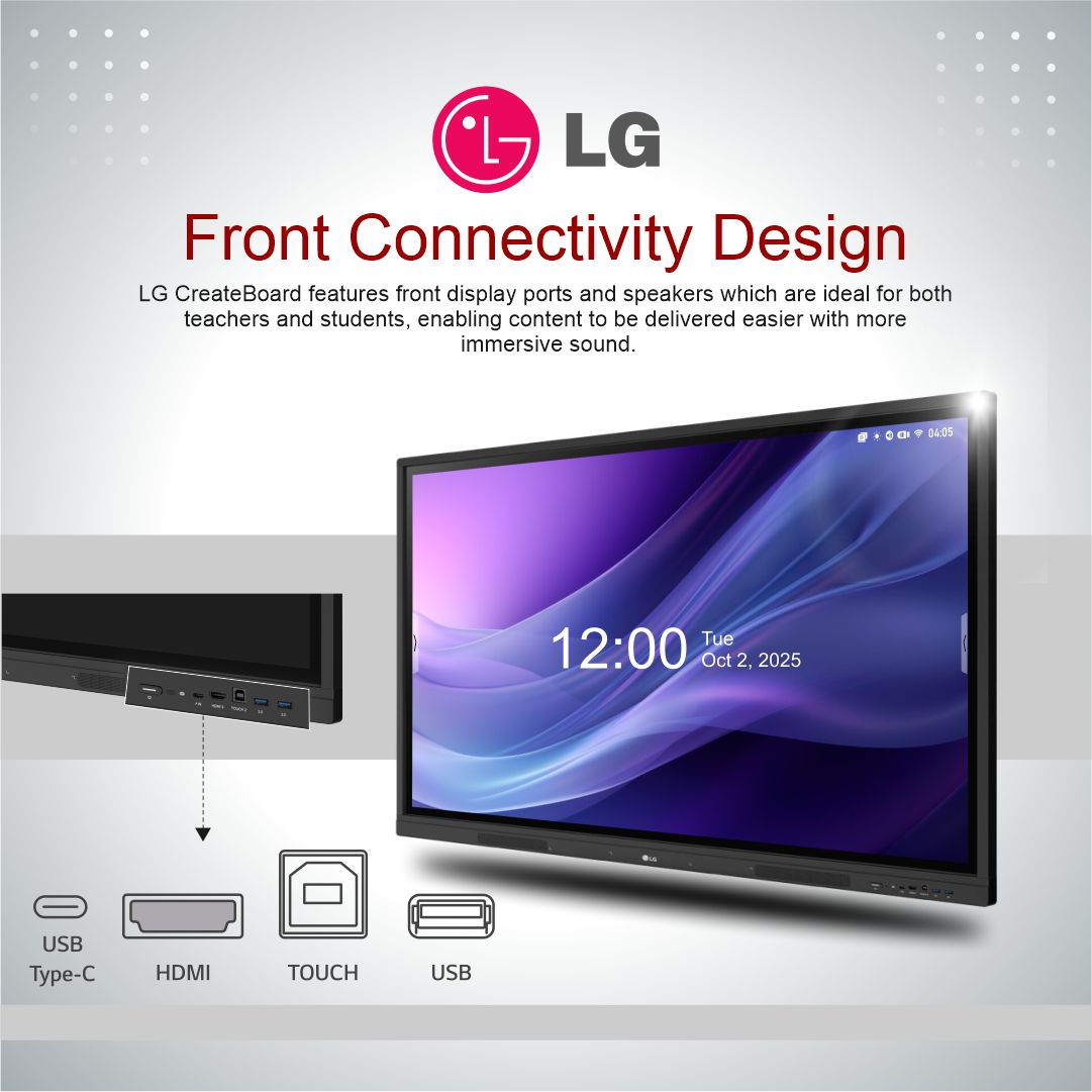 The LG CreateBoard 65-inch UHD Interactive Flat Panel is a cutting-edge digital board designed for education, enterprise collaboration, and hybrid classrooms. Featuring a 65-inch IPS display with 3840 × 2160 (UHD) resolution, 440 nits brightness, and 40-point multi-touch, it delivers ultra-clear visuals and smooth interaction.