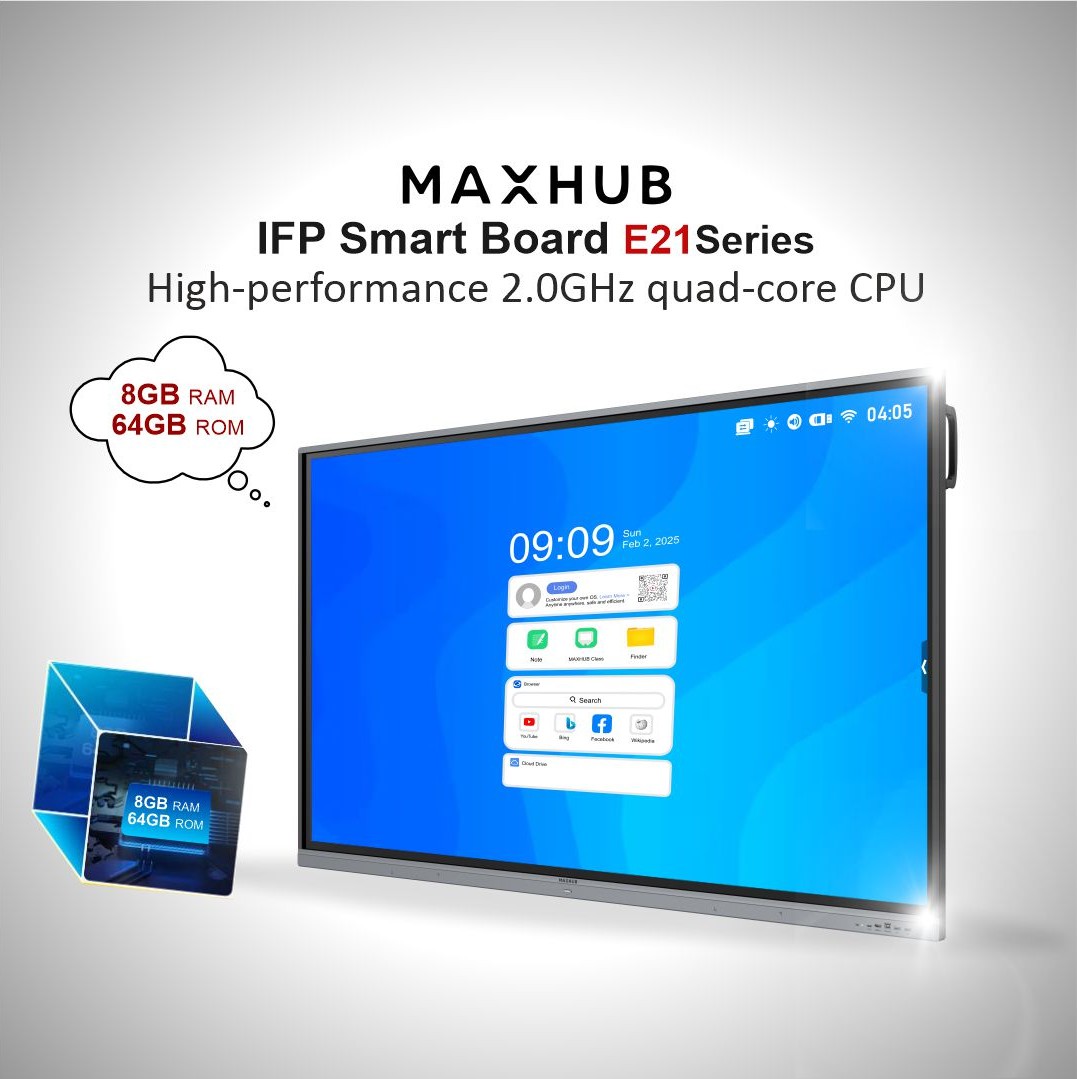 MAXHUB E2 Series 4K interactive panels with Android 13, 8GB RAM, 64GB storage, intelligent touch, and TÜV-certified eye & antibacterial care.