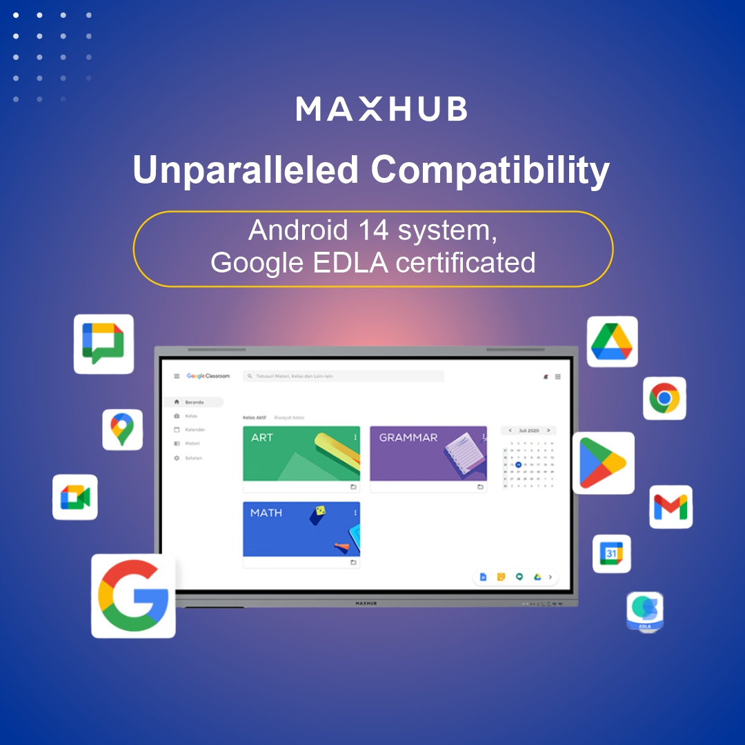 Running on Android 14 with Google EDLA certification, it integrates seamlessly with Google apps like Meet, Drive, and Classroom. TÜV-certified Low Blue Light and Flicker-Free technology ensures eye comfort during long teaching hours.
