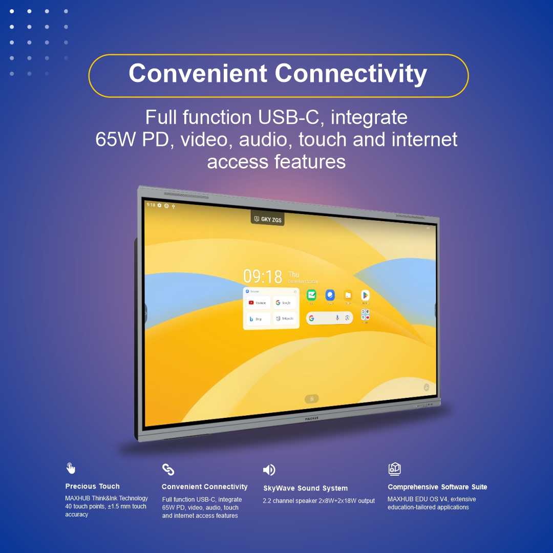 With versatile connectivity including full-function USB-C, Wi-Fi 6, Bluetooth 5.2, OPS slot, HDMI, Type-C, LAN, and screen sharing, teachers can easily connect and collaborate from multiple devices. Built-in SkyWave 2.2 channel speakers provide immersive classroom audio.