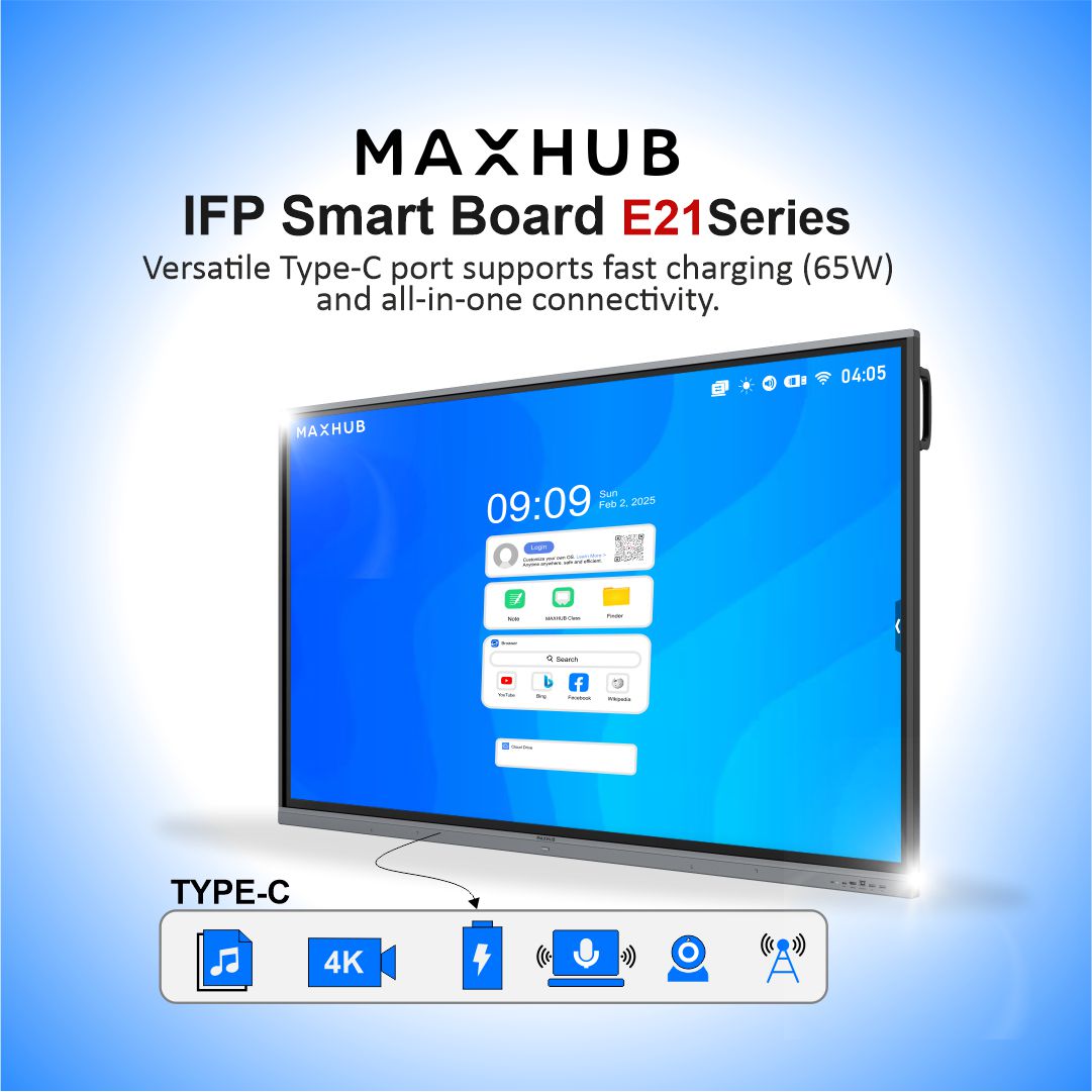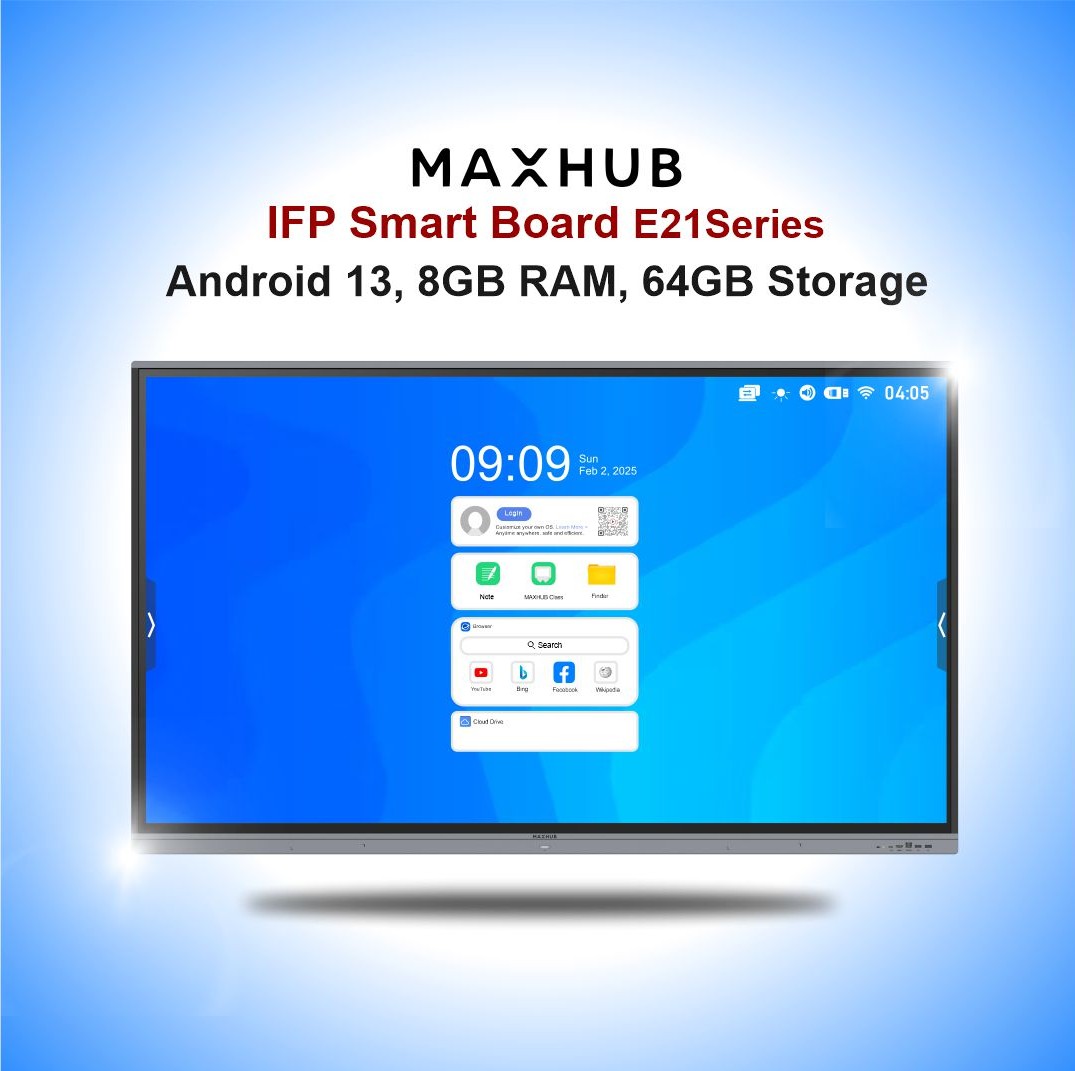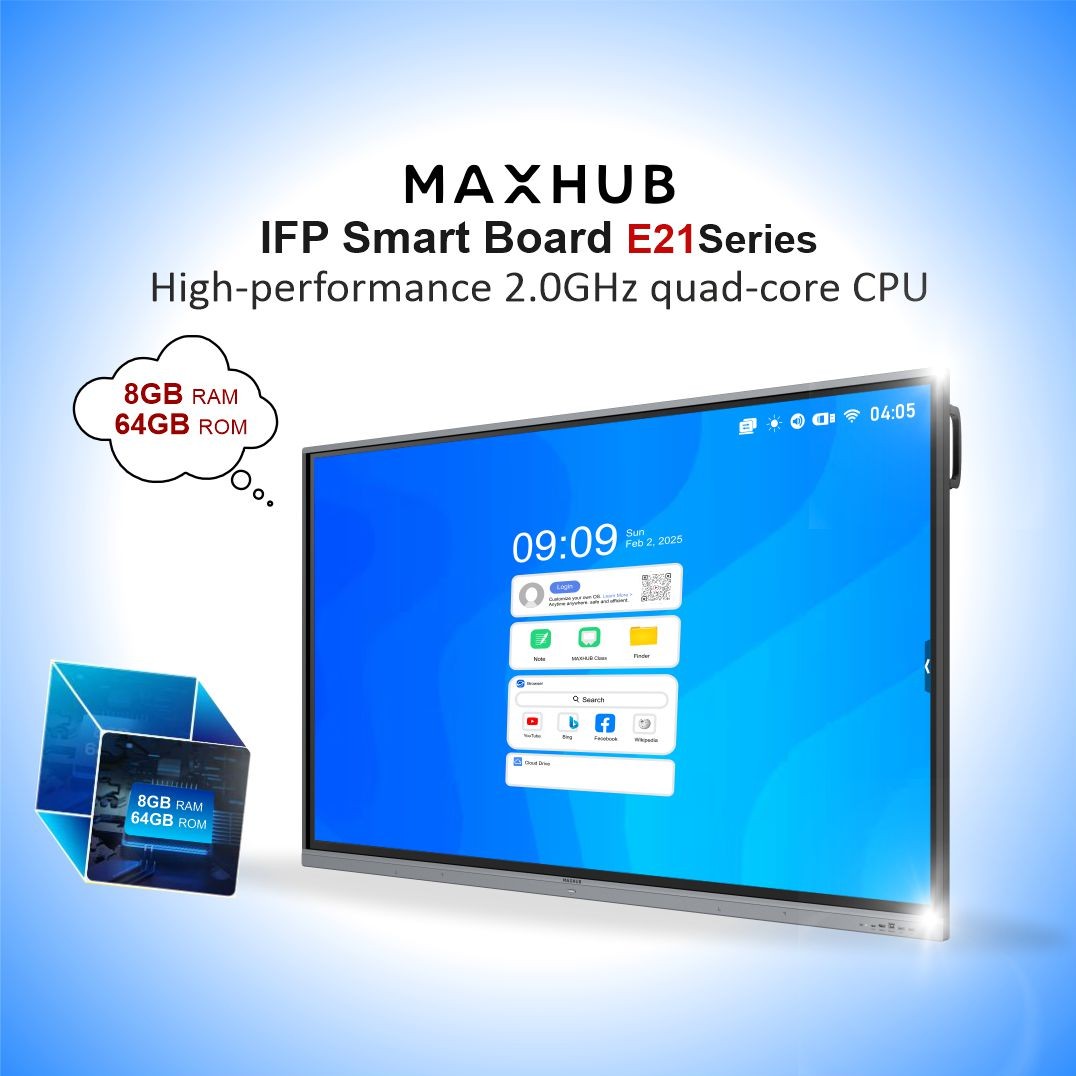 MAXHUB E2 Series 4K interactive panels with Android 13, 8GB RAM, 64GB storage, intelligent touch, and TÜV-certified eye & antibacterial care.