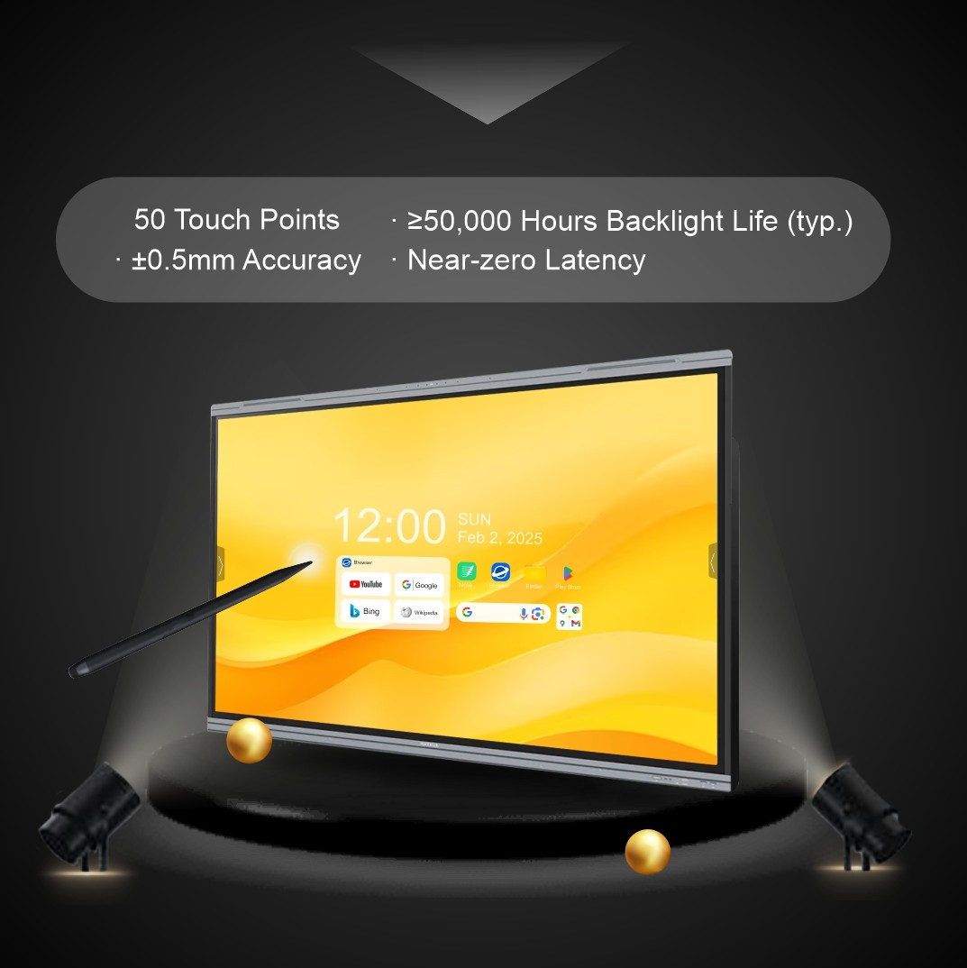 Its advanced infrared touchscreen supports 50-point multi-touch with near-zero latency (?2.5ms), zero parallax 3mm tempered glass, and ±0.5mm precision, offering a smooth and natural writing experience.