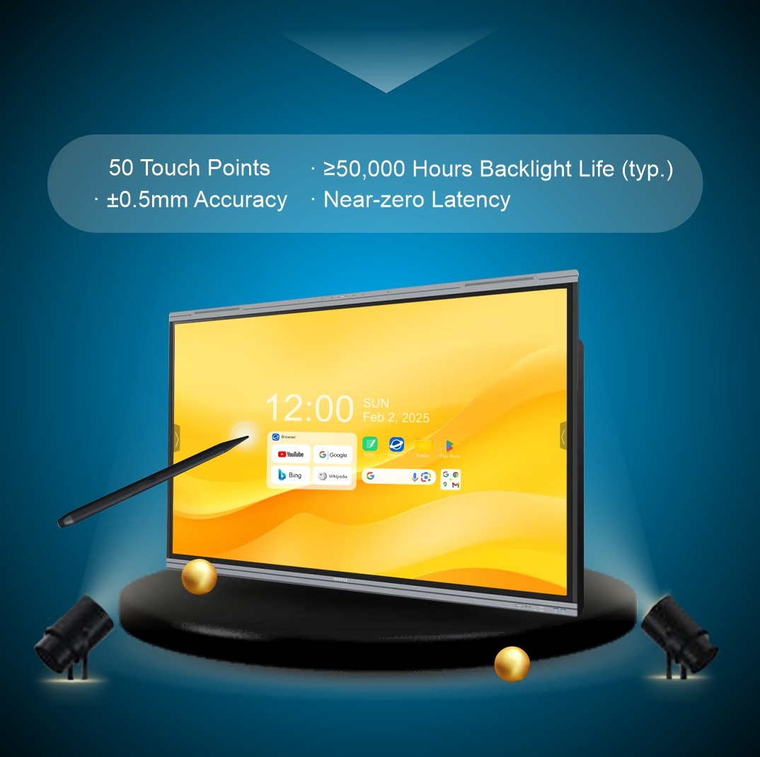 75-inch 4K UHD Interactive Flat Panel with Android 13, Google EDLA, 50-point touch, AI-powered performance, 500 nits brightness, and 8-mic array – ideal for smart classrooms and boardrooms.