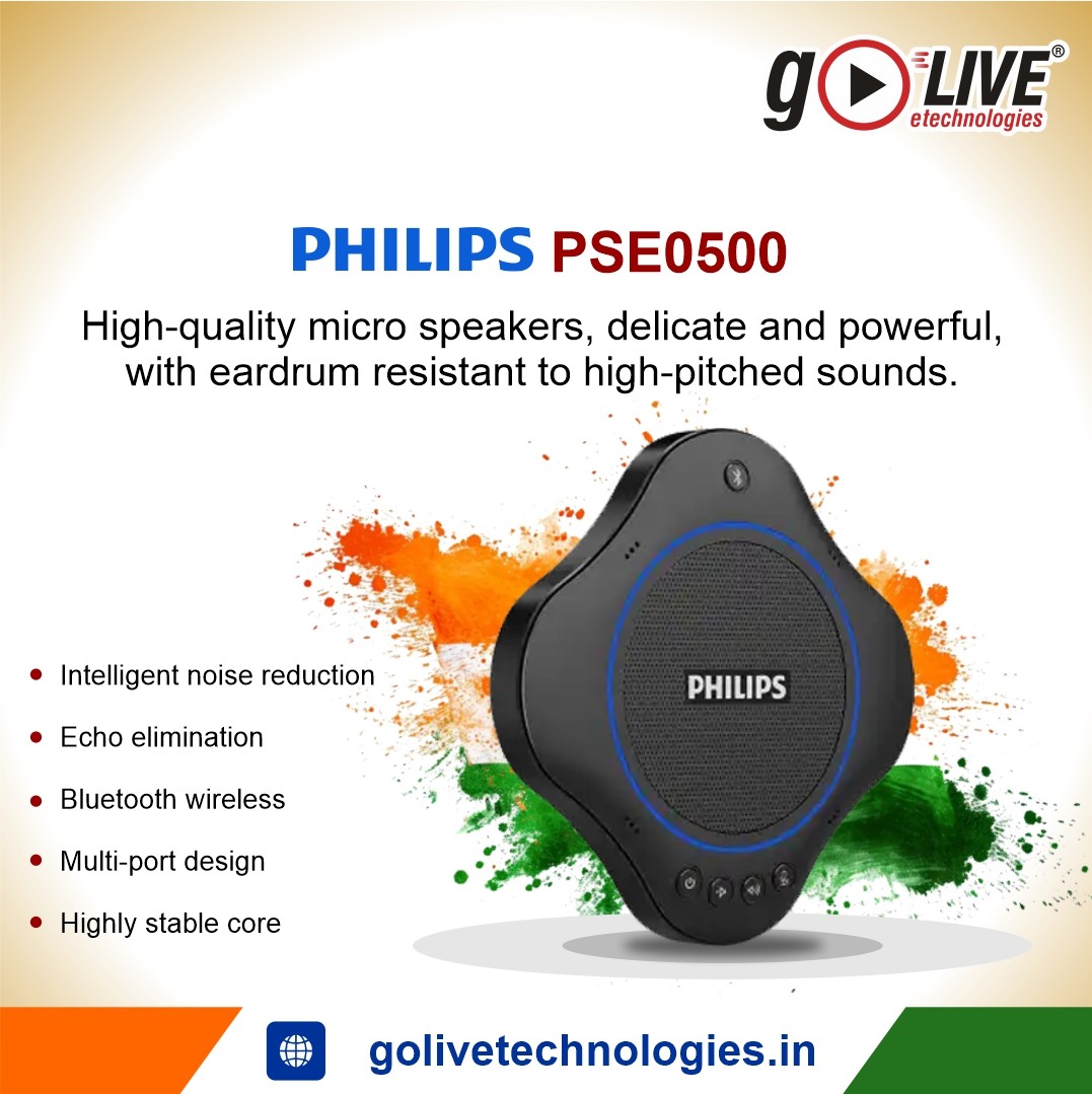 Philips PSE0500 is a 360° stereo conference speakerphone with 4-mic array, echo cancellation, intelligent noise reduction, Bluetooth & USB plug-and-play connectivity.