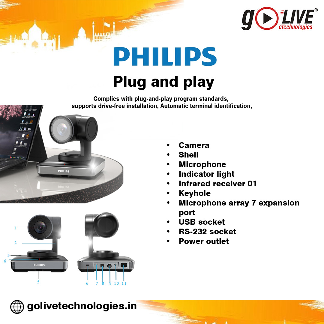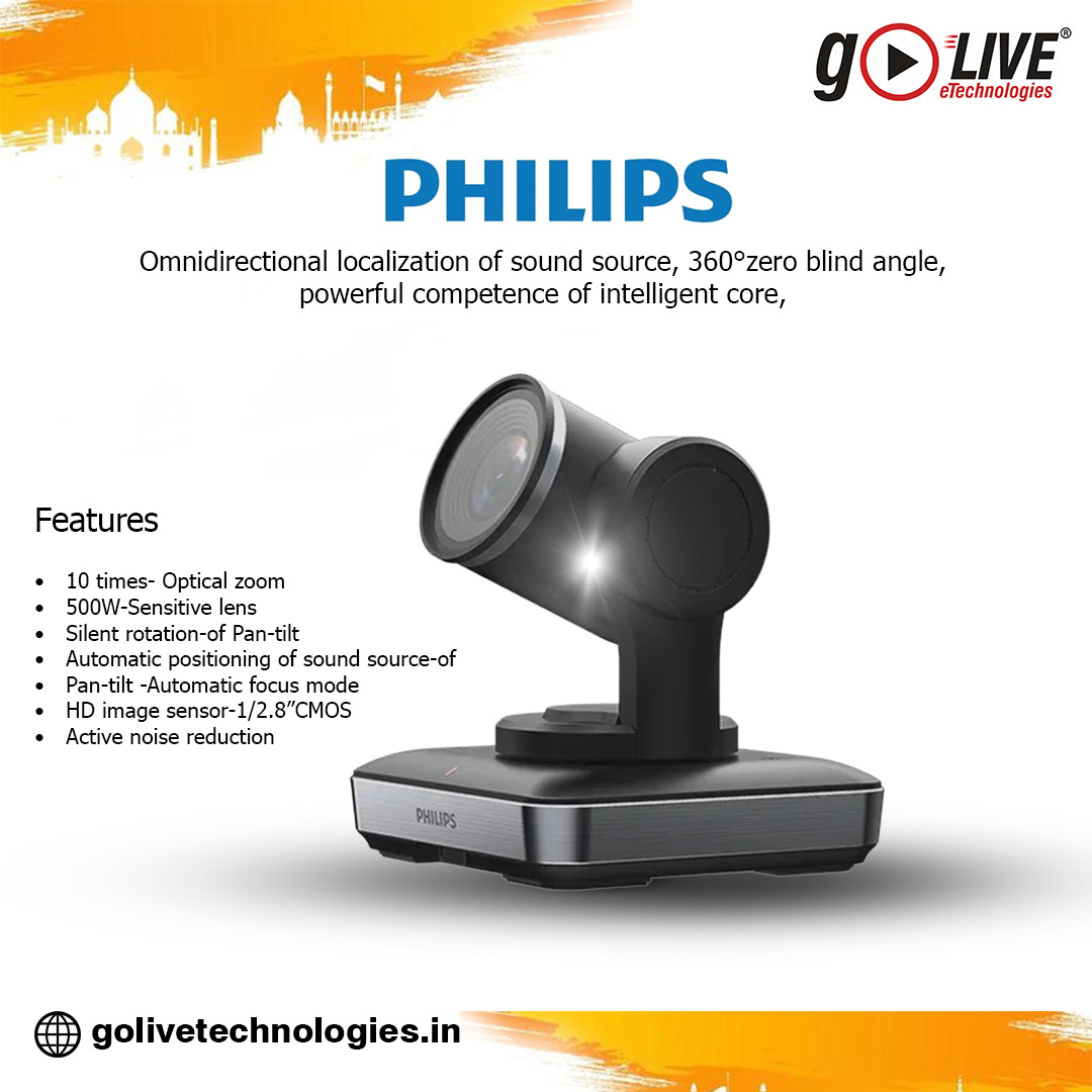 Philips PSE0600 is a professional 2K video conferencing camera with 10x optical zoom, AI-based sound tracking, silent pan-tilt, Sony CMOS sensor, and 4-mic array for smart meetings.